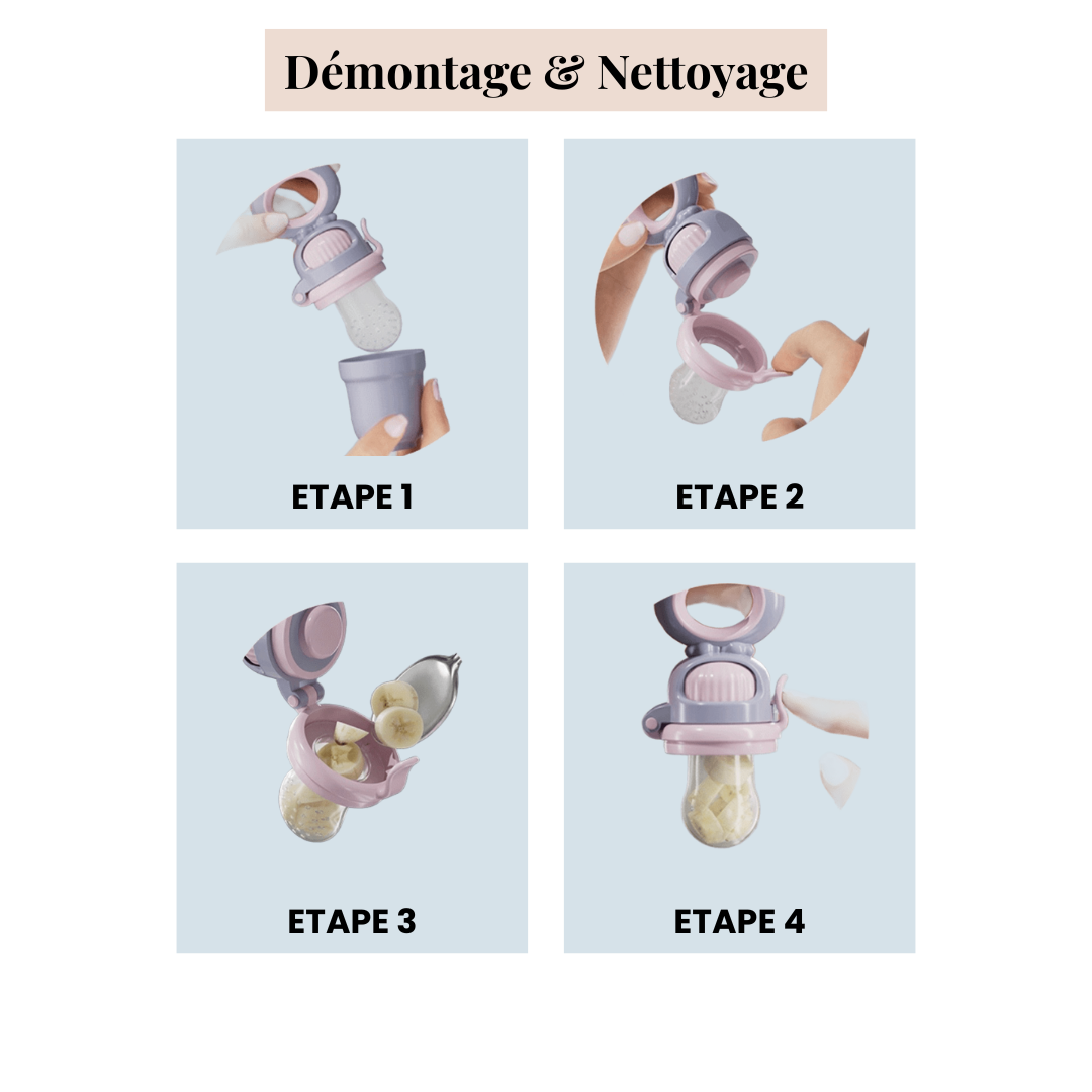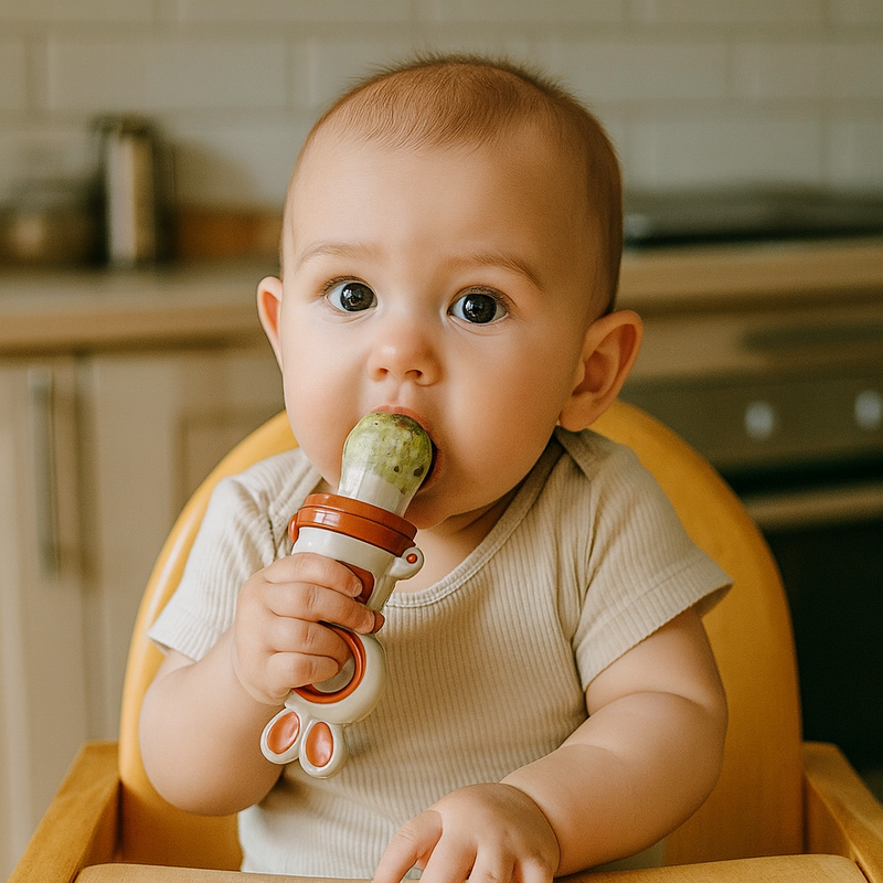 Grâce à sa molette innovante, la tétine permet de faire avancer les aliments sans gaspillage. Plus besoin d’écraser ni de couper trop finement : vous insérez le fruit, tournez, et bébé déguste facilement.
